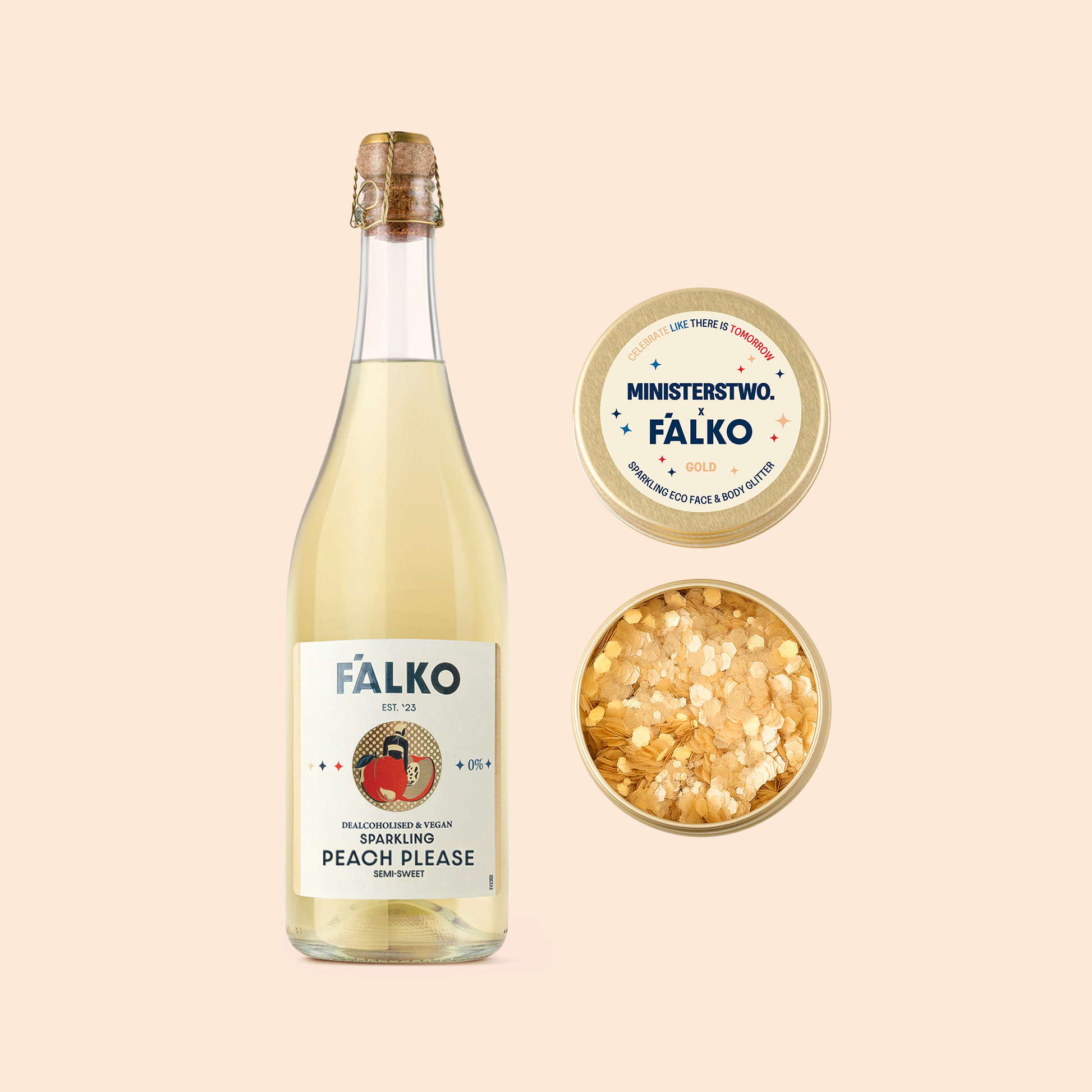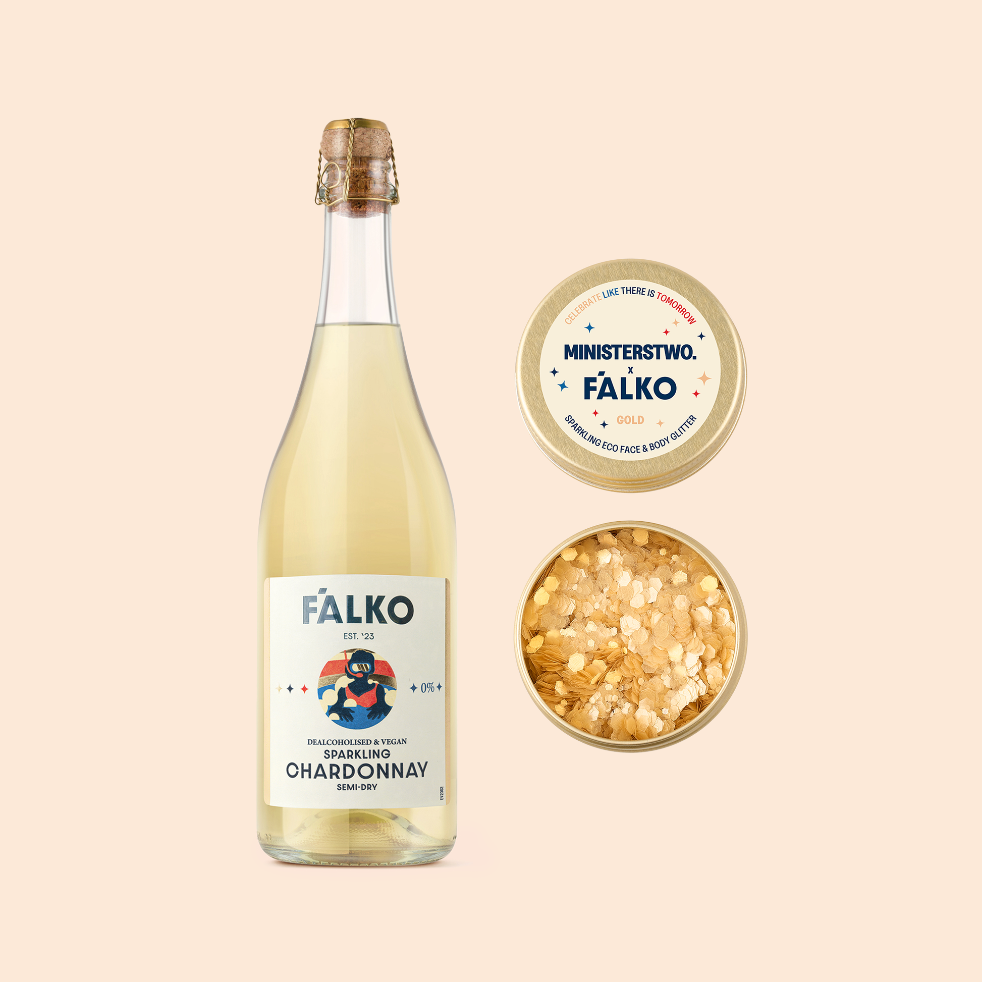 W skład zestawu wchodzi złoty, ekologiczny brokat ozdobny oraz duża butelka (750 ml) bezalkoholowych bąbelków.